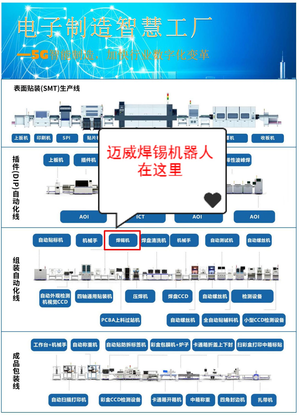 邁威是國內領先的焊錫解決方案專業提供商,專注于焊錫自動化領域,堅持務實的經營理念,持續創新,為廣大電子產品制造商提供有競爭力的焊錫設備。并致力于焊錫技術的研究與推廣,不斷提升客戶產品競爭力。公司自推出首臺電腦版焊錫機以來,不斷加大在焊錫領域的研發力度,陸續推出了多軸全自動焊錫機、視覺焊錫機、伺服焊錫機、全自動焊線機、智能激光焊錫機等產品。
